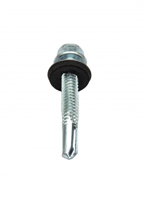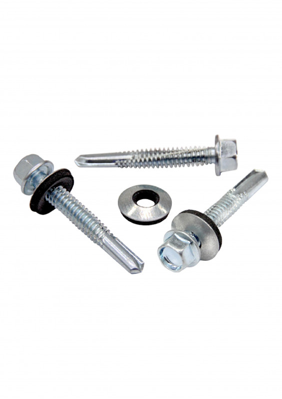 кровельный саморез имеет острый или сверлящий наконечник и шайбу с резиновой прокладкой. Резиновая прокладка служит для гидроизоляции крепления, устойчива к постоянным изменениям нагрузок, перемене температур и другим внешним условиям. Кровельный саморез вкручивается и с помощью шайбы, плотно притягивает кровельный материал к каркасу крыши, также за счет шайбы предотвращается попадание воды в места стыка. Кровельные саморезы представлены 2-х видов, в зависимости от материала использования. Кровельные саморезы диаметра 4.8 специально разработаны для крепления кровли к дереву, они имеют характерный редкий шаг резьбы и уменьшенное сверло. Кровельные саморезы диаметром 5.5 и 6.3 напротив созданы для монтажа в металл, на что указывает частая резьба и увеличенная сверловая часть.